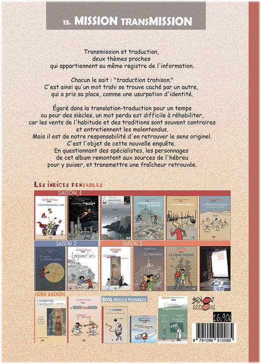 Transmission et traduction, deux thèmes proches qui appartiennent au même registre de l'information. Chacun le sait : "traduction trahison." C'est ainsi qu'un mot trahi se trouve caché par un autre, qui a pris sa place, comme une usurpation d'identité. égaré dans la translation-traduction pour un temps ou pour des siècles, un mot perdu est difficile à réhabiliter, car les vents de l'habitude et des traditions sont souvent contraires et entretiennent les malentendus. Mais il est de notre responsabilité d'en retrouver le sens originel. C'est l'objet de cette nouvelle enquête. En questionnant des spécialistes, les personnages de cet album remontent aux sources de l'hébreu pour y puiser, et transmettre une fraîcheur retrouvée.