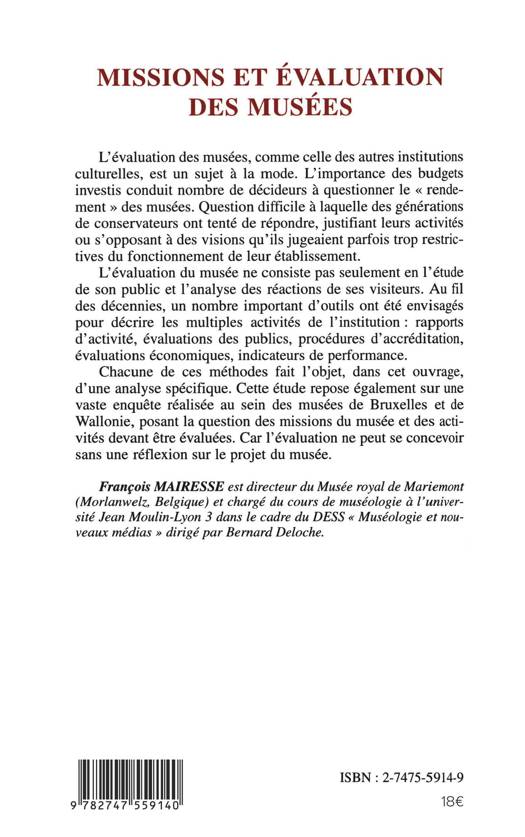 L'évaluation du musée ne consiste pas seulement en l'étude de son public et l'analyse des réactions de ses visiteurs. Un nombre important d'outils ont été envisagés pour décrire les multiples activités des musées : rapports d'activité, évaluations des publics, procédures d'accréditation, évaluations économiques, indicateurs de performance. Cette étude repose sur une vaste enquête réalisée au sein des musées de Bruxelles et de Wallonie.