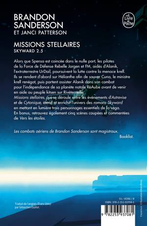 Alors que Spensa est coincée dans le nulle part, les pilotes de la Force de Défense Rebelle, Jorgen et FM, aidés d’Alanik, l’extraterrestre UrDail, portent secours à l’un de ses amis et deux planètes menacés par les Krell. Ils se rendent d’abord sur Hélianthe afin de sauver Cuna, le ministre krell renégat, puis partent assister Alanik dans son combat pour sauver sa planète natale RéAube avant de venir en aide au peuple kisten sur Éterrenelle, Missions stellaires, qui se déroule entre les événements d’Astrevise et de Cytonique, étend et enrichit l’univers des romans Skyward en mettant en lumière trois personnages essentiels de la saga.