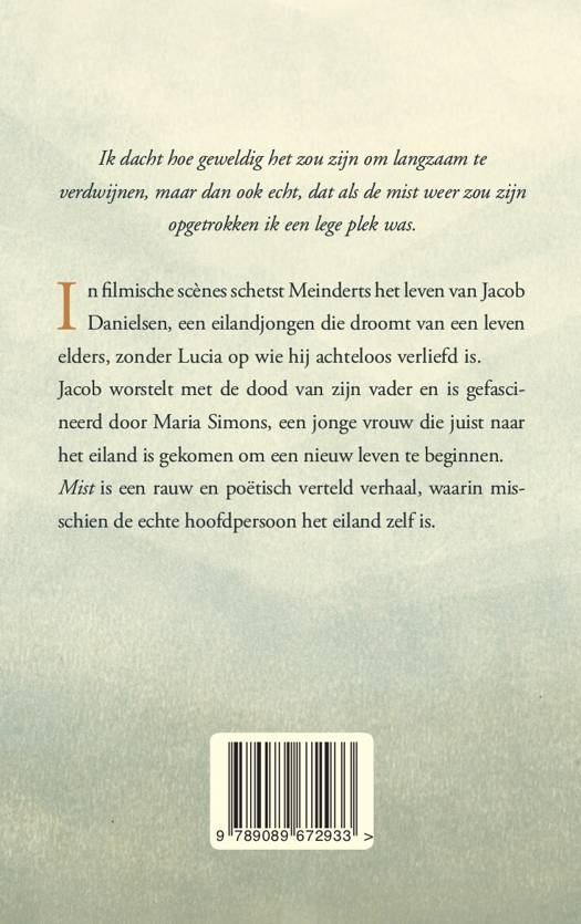 In filmische scènes schetst Meinderts het leven van Jacob Danielsen, een eilandjongen die droomt van een leven elders, zonder Lucia op wie hij achteloos verliefd is. Jacob worstelt met de dood van zijn vader en is gefascineerd door Maria Simons, een jonge vrouw die juist naar het eiland is gekomen om een nieuw leven te beginnen. Mist is een rauw en poëtisch verteld verhaal, waarin misschien de echte hoofdpersoon het eiland zelf is.