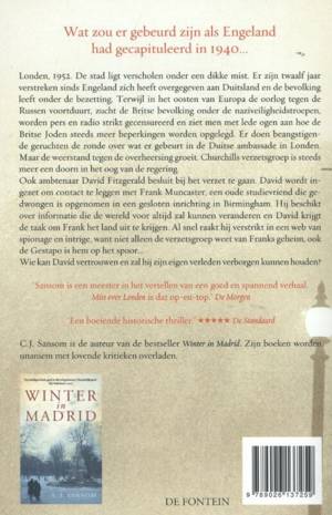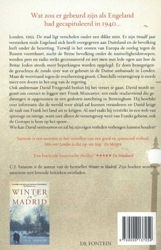 Een nieuwe historische roman van de schrijver van ‘Winter in Madrid’ Wat zou er gebeurd zijn als Engeland had gecapituleerd in 1940… Londen, 1952. De stad ligt verscholen onder een dikke mist. Er zijn twaalf jaar verstreken sinds Engeland zich heeft overgegeven aan Duitsland en de bevolking leeft onder de bezetting. Terwijl in het oosten van Europa de oorlog tegen de Russen voortduurt, zucht de Britse bevolking onder de nazi veiligheidstroepen, worden pers en radio strikt gecensureerd en ziet men met lede ogen aan hoe de Britse Joden steeds meer beperkingen worden opgelegd. Er doen beangstigende geruchten de ronde over wat er gebeurt in de Duitse ambassade in Londen. Maar de weerstand tegen de overheersing groeit. Churchills verzetsgroep is steeds meer een doorn in het oog van de regering. Ook ambtenaar David Fitzgerald besluit bij het verzet te gaan. David wordt ingezet om contact te leggen met Frank Muncaster, een oude studievriend van hem. Frank is gedwongen opgenomen in een gesloten inrichting in Birmingham. Hij beschikt over informatie die de wereld voor altijd zal kunnen veranderen en David krijgt de taak om Frank het land uit te krijgen. Al snel raakt hij verstrikt in een web van spionage en intrige, want niet alleen de verzetsgroep weet van Franks geheim, ook de Gestapo is hem op het spoor... Wie kan David vertrouwen en zal hij zijn eigen verleden verborgen kunnen houden? C.J. Sansom (1952) ontwaakte aan het eind van zijn tienerjaren uit een kleurloze jeugd als enig kind in een gezin waar geen boeken werden gelezen. Hij promoveerde als historicus, maar ging vervolgens rechten studeren. Nadat Sansom jarenlang als advocaat had gewerkt, bood een erfenis hem de kans om de Shardlake-serie te schrijven. Deze historische thrillerreeks werd inmiddels wereldwijd met lovende kritieken overladen.Zijn eerste historische thriller ‘Winter in Madrid’ werd een wereldwijde bestseller. ‘Er zijn dit jaar weinig historische romans verschenen die zo goed zijn.’ The Sunday Times ‘Elk detail klopt… Als historische roman én als thriller is ‘Mist over Londen’ boeiend, scherp en beklemmend.’ Independent on Sunday ‘Een fascinerende, doordachte spionagethriller… Beeldend en goed getroffen, met een zeer overtuigend what-if.’ The Times ‘Een fantastische roman die vooropgezette meningen over onze geschiedenis opschudt, terwijl de rillingen je over de rug lopen.’ The Guardian ‘Historici zien what-if plots als de speed van hun vak, om goedkoop high van te worden. Maar romanschrijvers scheppen een parallelle werkelijkheid met ieder boek.’ Independent ‘Mist over Londen’ is een van die zeldzame boeken die niet alleen spannend zijn, maar ook aanzetten tot nadenken.’ Spectator ‘Spannend en met meeslepende plotwendingen, maar wat dit prachtige boek echt onderscheidt is de precieze beschrijving van een samenleving die zomaar werkelijkheid had kunnen zijn.’ Literary Review
