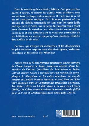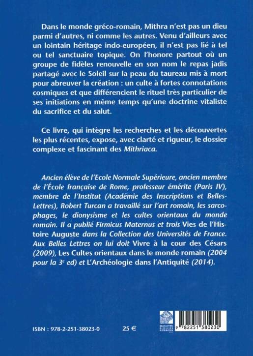 English summary: The cult of Mithra was not like others in the Roman Empire. Drawing on Indo-European roots, the cult was practiced anywhere followers shared the ceremonial feast in the gods name. This book demonstrates the unique cosmic and salvific aspects of this complex and fascinating religion. French description: Dans le monde greco-romain, Mithra n'est pas un dieu parmi les autres, ni comme les autres. Venu d'ailleurs avec un lointain heritage indo-europeen, il n'est pas lie a tel ou tel sanctuaire topique. On l'honore partout ou un groupe de fideles renouvelle en son nom le repas jadis partage avec le Soleil sur la peau du taureau mis a mort pour abreuver la creation: un culte a fortes connotations cosmiques et que differencient le rituel tres particulier de ses initiations en meme temps qu'une doctrine vitaliste du sacrifice et du salut. Ce livre, qui integre les recherches et les decouvertes les plus recentes, expose, avec clarte et rigueur, le dossier complexe et fascinant des Mithriaca. Ancien eleve de l'Ecole Francaise de Rome, membre de l'Institut, Robert Turcan, professeur emerite a la Sorbonne, a publie, tant en France qu'a l'etranger, de nombreux ouvrages qui font autorite sur l'Antiquite romaine. On lui doit notamment Heliogabale et le sacre du soleil, Mithras Platonicus, Religion romaine, L'Art romain dans l'histoire et, aux Belles Lettres, Vivre a la cour des Cesars et Les Cultes orientaux dans le monde romain.