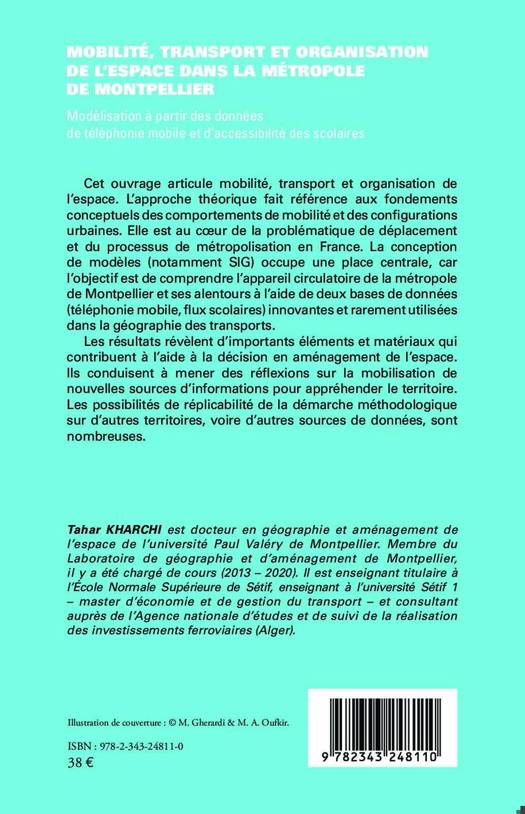 Cet ouvrage articule mobilité, transport et organisation de l'espace. L'approche théorique fait référence aux fondements conceptuels des comportements de mobilité et des configurations urbaines. Elle est au coeur de la problématique de déplacement et du processus de métropolisation en France. La conception de modèles (notamment SIG) occupe une place centrale, car l'objectif est de comprendre l'appareil circulatoire de la métropole de Montpellier et ses alentours à l'aide de deux bases de données (téléphonie mobile, flux scolaires) innovantes et rarement utilisées dans la géographie des transports. Les résultats révèlent d'importants éléments et matériaux qui contribuent à l'aide à la décision en aménagement de l'espace. Ils conduisent à mener des réflexions sur la mobilisation de nouvelles sources d'informations pour appréhender le territoire. Les possibilités de réplicabilité de la démarche méthodologique sur d'autres territoires, voire d'autres sources de données, sont nombreuses.