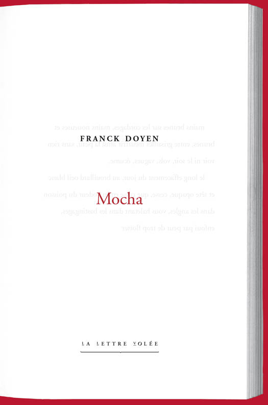 Mocha construit, au fur et à mesure de ses fragments poétiques, un récit. Le « vous », qui est le personnage auquel le texte s’adresse, dérive, seul sur l’océan. entre le réel et l’imaginaire, en proie aux éléments, à la faim, à la solitude, le personnage perd l’usage de la langue et s’animalise. Ce livre est une véritable descente le long des zones océaniques, et une remonté jusqu’à l’île de Mocha, faisant ainsi entrer ce texte en résonnance avec Moby Dick de Melville, et en particulier, avec la mythologie Mapuche,et les peuples d’Araucanie et de Patagonie. Écrite dans une langue nette, claire, limpide, cette suite atteint des profondeurs poétiques auxquelles nous sommes peu habitués.Franck Doyen (1970), écrivain, poète et coordonnateur du Festival d’écritures poétiques contemporaines, Poema (rattachées à la région Grand-est en France). il s’est occupé pendant dix ans de la revue de poésies contemporaines 22(M)dP. Il collabore actuellement à la maison d’édition Faï fioc à Montpellier. Il a déjà publié Lettres à la Première Bosse (Propos/2 éditions, 2007) ; EC / rire au moment où (L’atelier de l’agneau, réédition 2012) ; B.I.O.bio - un désastre autobiographique (Propos/2éditions, 2010) ; Inventaire de début du jour (L’atelier de l’agneau, 2011) ; VOUS dans la montagne (Le Dernier télégramme, 2012) ; Littoral (L’atelier de l’agneau, 2013) ; Champs de lutte (Æncrages & co, 2014) ; collines, ratures (La Lettre volée, 2016).