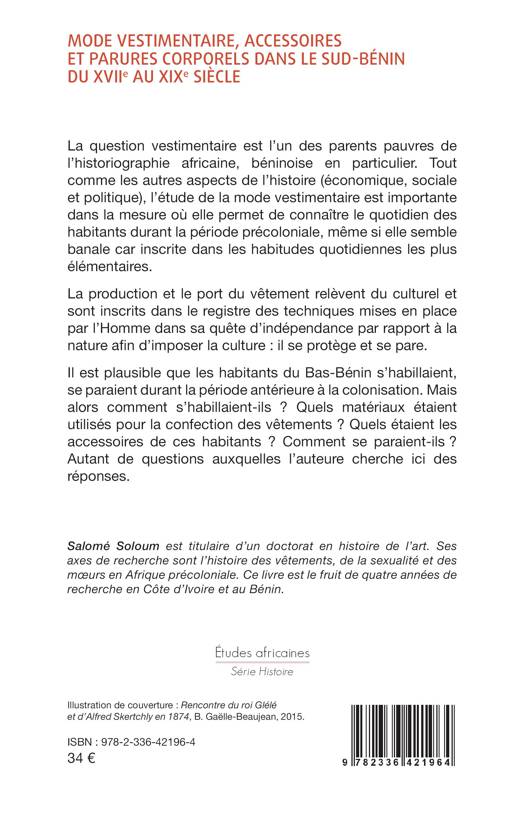 La question vestimentaire est l’un des parents pauvres de l’historiographie africaine, béninoise en particulier. Tout comme les autres aspects de l’histoire (économique, sociale et politique), l’étude de la mode vestimentaire est importante dans la mesure où elle permet de connaître le quotidien des habitants durant la période précoloniale, même si elle semble banale car inscrite dans les habitudes quotidiennes les plus élémentaires. La production et le port du vêtement relèvent du culturel et sont inscrits dans le registre des techniques mises en place par l’Homme dans sa quête d’indépendance par rapport à la nature afin d’imposer la culture : il se protège et se pare. Il est plausible que les habitants du Bas-Bénin s’habillaient, se paraient durant la période antérieure à la colonisation. Mais alors comment s’habillaient-ils ? Quels matériaux étaient utilisés pour la confection des vêtements ? Quels étaient les accessoires de ces habitants ? Comment se paraient-ils ? Autant de questions auxquelles l’auteure cherche ici des réponses.