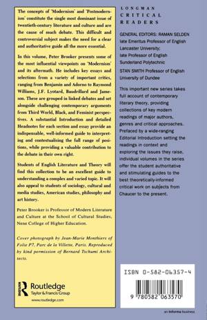 In this influential volume, Peter Brooker presents some of the key viewpoints of modernism and postmodernism from a variety of major critics and sets these alongside challenging arguments from Third World, Black and Feminist perspectives. His excellent introduction and detailed headnotes for each section and essay provide an indispensable guide to interpreting the many different opinions, and prove to be valuable contributions in their own right.