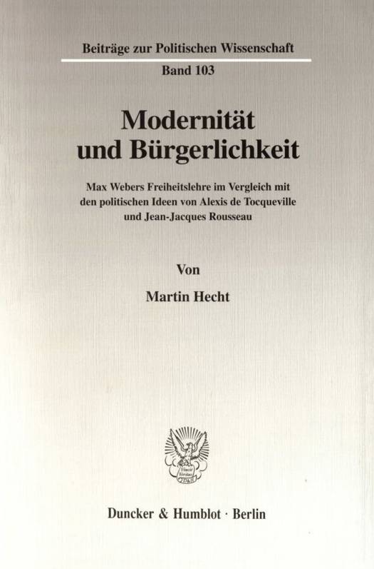 Mit »Modernität und Bürgerlichkeit« legt Martin Hecht eine für die internationale Max-Weber-Forschung ungewöhnliche Schrift vor. Er vergleicht darin die politisch-philosophischen Ideen Max Webers mit denjenigen zweier praktischer Philosophen, die beide viel älteren geistesgeschichtlichen Epochen angehören: Jean-Jacques Rousseau und Alexis de Tocqueville.