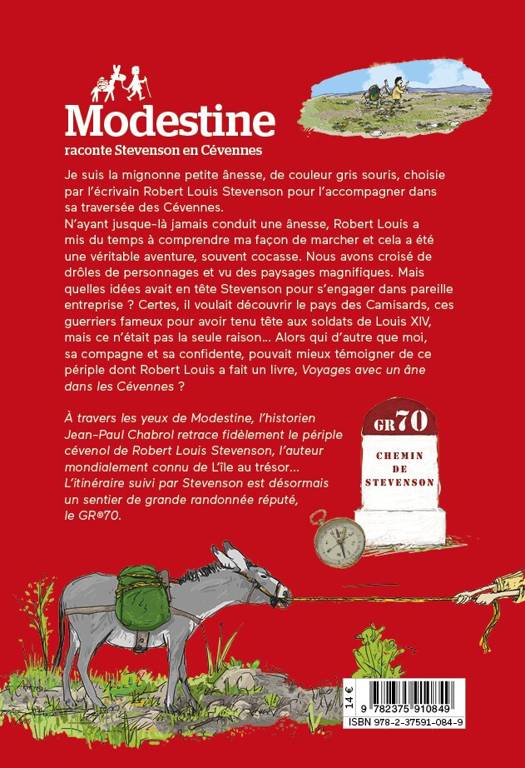 À travers les yeux de Modestine, l'historien Jean-Paul Chabrol retrace fidèlement le périple cévenol de Robert Louis Stevenson, l'auteur mondialement connu de L'île au trésor... L'itinéraire suivi par Stevenson est désormais un sentier de grande randonnée réputé, le GR®70.