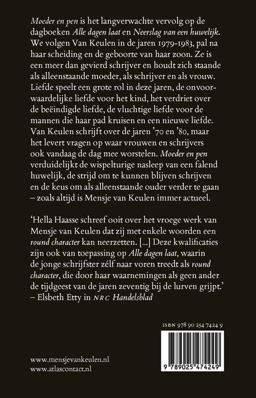 ‘Moeder en pen’ is het langverwachte vervolg van Mensje van Keulen op de dagboeken ‘Alle dagen laat’ en ‘Neerslag van een huwelijk’. We volgen Van Keulen in de jaren 1979-1983, pal na haar scheiding en de geboorte van haar zoon. Ze is een meer dan gevierd schrijver en houdt zich staande als alleenstaande moeder, als schrijver en als vrouw. Liefde speelt een grote rol in deze jaren, de onvoorwaardelijke liefde voor het kind, het verdriet over de beëindigde liefde, de vluchtige liefde voor de mannen die haar pad kruisen en een nieuwe liefde. Van Keulen schrijft over de jaren ’70 en ’80, maar het levert vragen op waar vrouwen en schrijvers ook vandaag de dag mee worstelen. ‘Moeder en pen’ verduidelijkt de wispelturige nasleep van een falend huwelijk, de strijd om te kunnen blijven schrijven en de keus om als alleenstaande ouder verder te gaan – zoals altijd is Mensje van Keulen immer actueel.