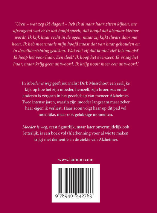 'Uren - wat zeg ik? dagen! - heb ik al naar haar zitten kijken, me afvragend wat er in dat hoofd speelt, dat hoofd dat alsmaar kleiner wordt. Ik kijk haar recht in de ogen, maar zij kijkt dwars door me heen. Ik heb meermaals mijn hoofd naast dat van haar gehouden en in dezelfde richting gekeken. Wat ziet zij dat ik niet zie? Iets moois? Ik hoop het voor haar. Een doel? Ik hoop het evenzeer. Ik vraag het haar, maar krijg geen antwoord. Ik krijg nooit meer een antwoord.' In Moeder is weg geeft journalist Dirk Musschoot een eerlijke kijk op hoe het zijn moeder, hemzelf, zijn broer, zus en de anderen is vergaan in het gezelschap van meneer Alzheimer. Twee intense jaren, waarin zijn moeder langzaam maar zeker haar eigen ik verliest. Haar zoon volgt haar op dit pad vol moeilijke, maar ook gelukkige momenten. Moeder is weg, eerst figuurlijk, maar later onvermijdelijk ook letterlijk, is een boek vol (h)erkenning voor al wie te maken krijgt met dementie en de ziekte van Alzheimer.