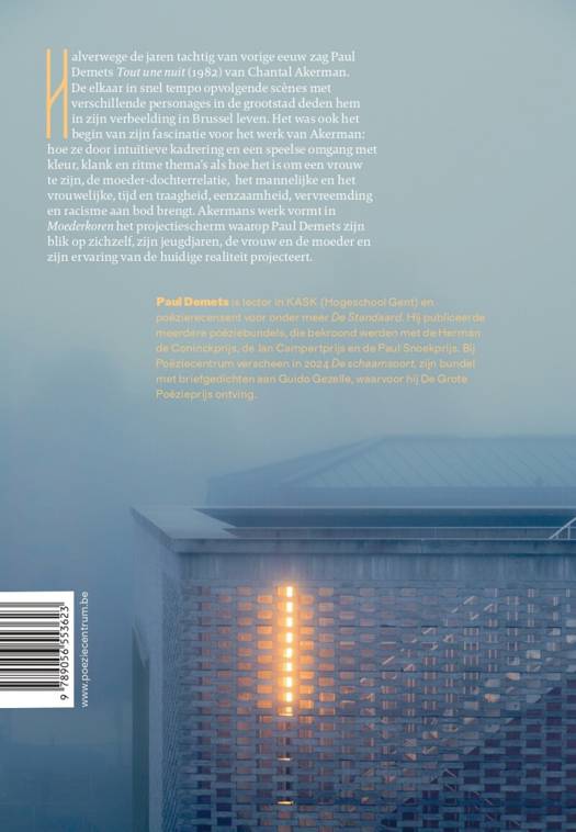 Halverwege de jaren tachtig van vorige eeuw zag Paul Demets Tout une nuit (1982) van Chantal Akerman. De elkaar in snel tempo opvolgende scènes met verschillende personages in de grootstad deden hem in zijn verbeelding in Brussel leven. Het was ook het begin van zijn fascinatie voor de films van Akerman: hoe ze door intuïtieve kadrering en een speelse omgang met kleur, klank en ritme thema’s als hoe het is om een vrouw te zijn, de moederdochterrelatie, tijd en traagheid, eenzaamheid en vervreemding, racisme en migratie aan bod brengt. Haar werk vormt in Moederkorenhet projectiescherm waarop Paul Demets zichzelf en zijn ervaring van de werkelijkheid projecteert. Poëzie die, exact tien jaar na haar overlijden, in dialoog gaat met het werk van befaamde cineaste Chantal Akerman.