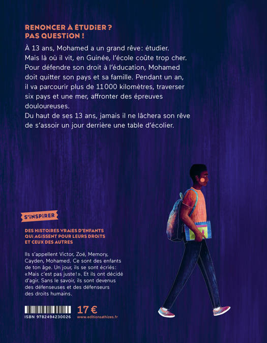 À 13 ans, Mohamed a un grand rêve : étudier. Mais là où il vit, en Guinée, l'école coûte trop cher. Pour défendre son droit à l'éducation, Mohamed doit quitter son pays et sa famille. Pendant un an, il va parcourir plus de 11 000 kilomètres, traverser six pays et une mer, affronter des épreuves douloureuses. Du haut de ses 13 ans, jamais il ne lâchera son rêve de s'assoir un jour derrière une table d'écolier.