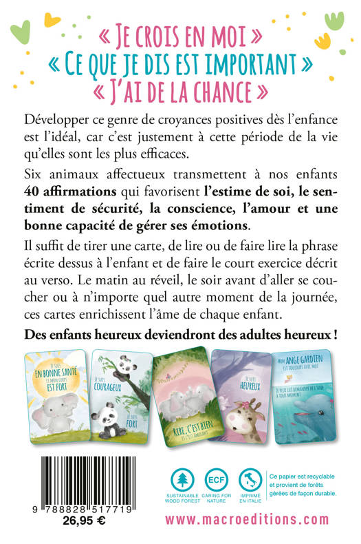 Six animaux affectueux transmettent à nos enfants 40 affirmations qui favorisent l’estime de soi, le sentiment de sécurité, la conscience, l’amour et une bonne capacité de gérer ses émotions.
