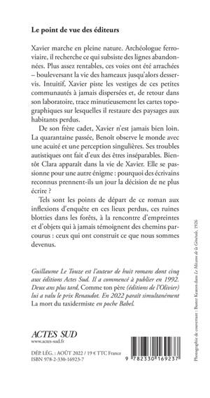 Xavier marche en pleine nature. Archéologue ferroviaire, il recherche ce qui subsiste des lignes abandonnées. Plus assez rentables, ces voies ont été arrachées - bouleversant la vie des hameaux jusqu'alors desservis. Intuitif, Xavier piste les vestiges de ces petites communautés à jamais dispersées et, de retour dans son laboratoire, trace minutieusement les cartes topographiques sur lesquelles il restaure des paysages aux habitants perdus. De son frère cadet, Xavier n'est jamais bien loin. La quarantaine passée, Benoît observe le monde avec une acuité et une perception singulières. Ses troubles autistiques ont fait d'eux des êtres inséparables. Bientôt Clara apparaît dans la vie de Xavier. Elle se passionne pour une autre énigme : pourquoi des écrivains reconnus prennent-ils un jour la décision de ne plus écrire ? Tels sont les points de départ de ce roman aux inflexions d'enquête en ces lieux perdus, ces ruines blotties dans les forêts, à la rencontre d'empreintes et d'objets qui à jamais témoignent des chemins parcourus : ceux qui ont construit ce que nous sommes devenus.