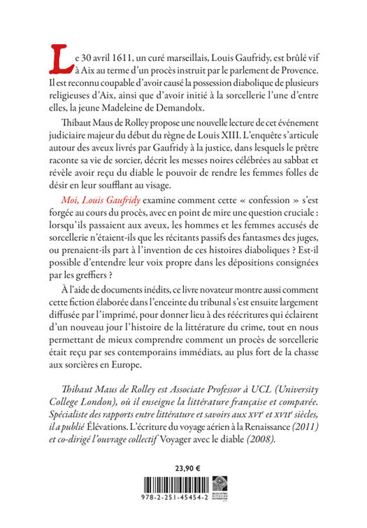 Thibaut Maus de Rolley propose une nouvelle lecture de cet événementjudiciaire majeur du début du règne de Louis XIII. L’enquête s’articule autour des aveux livrés par Gaufridy à la justice, dans lesquels le prêtre raconte sa vie de sorcier, décrit les messes noires célébrées au sabbat et révèle avoir reçu du diable le pouvoir de rendre les femmes folles de désir en leur soufflant au visage.