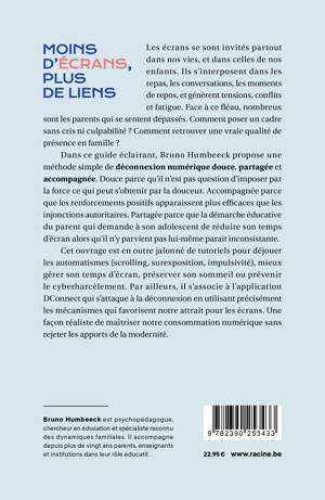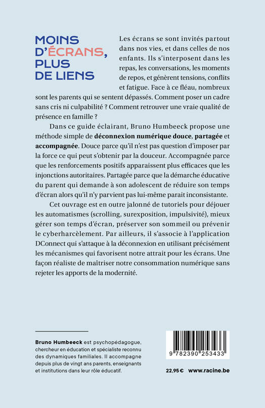 Dans ce guide éclairant, Bruno Humbeeck propose une méthode simple de déconnexion numérique douce, partagée et accompagnée. Douce parce qu'il n'est pas question d'imposer par la force ce qui peut s'obtenir par la douceur. Accompagnée parce que les renforcements positifs apparaissent plus efficaces que les injonctions autoritaires. Partagée parce que la démarche éducative du parent qui demande à son adolescent de réduire son temps d'écran alors qu'il n'y parvient pas lui-même parait inconsistante.