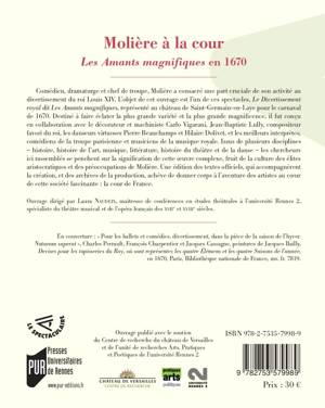 Comédien, dramaturge et chef de troupe, Molière a consacré une part cruciale de son activité au divertissement du roi Louis XIV. L'objet de cet ouvrage est l'un de ces spectacles, Le Divertissement royal dit Les Amants magnifiques, représenté au château de Saint-Germain-en-Laye pour le carnaval de 1670. Destiné à faire éclater la plus grande variété et la plus grande magnificence, il fut conçu en collaboration avec le décorateur et machiniste Carlo Vigarani, Jean-Baptiste Lully, compositeur favori du roi, les danseurs virtuoses Pierre Beauchamps et Hilaire Dolivet, et les meilleurs interprètes, comédiens de la troupe parisienne et musiciens de la musique royale. Issus de plusieurs disciplines – histoire, histoire de l'art, musique, littérature, histoire du théâtre et de la danse – les chercheurs ici rassemblés se penchent sur la signification de cette oeuvre complexe, fruit de la culture des élites aristocratiques et des préoccupations de Molière. Une édition des textes officiels, qui accompagnèrent la création, et des archives de la production, achève de donner corps à l'aventure des artistes au coeur de cette société fascinante : la cour de France.