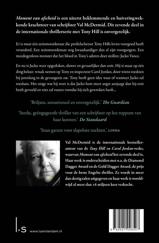 In Moment van afscheid, het zevende deel uit Val McDermids Tony Hill en Carol Jordan-reeks, duikt een seriemoordenaar uit het verleden weer op, en hij heeft het op Tony en Carol gemunt.