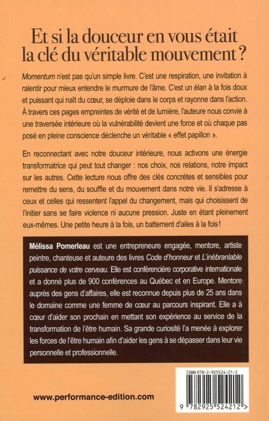 Momentum n’est pas qu’un simple livre. C’est une respiration, une invitation à ralentir pour mieux entendre le murmure de l’âme. C’est un élan à la fois doux et puissant qui naît du coeur, se déploie dans le corps et rayonne dans l’action. À travers ces pages empreintes de vérité et de lumière, l’auteure nous convie à une traversée intérieure où la vulnérabilité devient une force et où chaque pas posé en pleine conscience déclenche un véritable « effet papillon ». En reconnectant avec notre douceur intérieure, nous activons une énergie transformatrice qui peut tout changer : nos choix, nos relations, notre impact sur les autres. Cette lecture nous offre des clés concrètes et sensibles pour remettre du sens, du souffle et du mouvement dans notre vie. Il s’adresse à ceux et celles qui ressentent l’appel du changement, mais qui choisissent de l’initier sans se faire violence ni aucune pression. Juste en étant pleinement eux-mêmes. Une petite heure à la fois, un battement d’ailes à la fois !