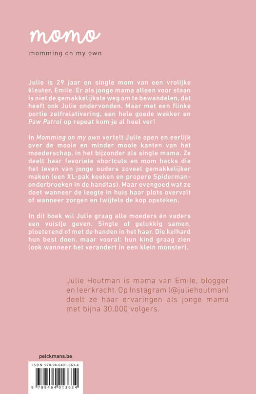 In Momming on my own vertelt Julie open en eerlijk over de mooie en minder mooie kanten van het moederschap, in het bijzonder als single mama. Ze deelt haar favoriete shortcuts en mom hacks die het leven van jonge ouders zoveel gemakkelijker maken (een XL-pak koeken en propere Spiderman-onderbroeken in de handtas). Maar evengoed wat ze doet wanneer de leegte in huis haar plots overvalt of wanneer zorgen en twijfels de kop opsteken.