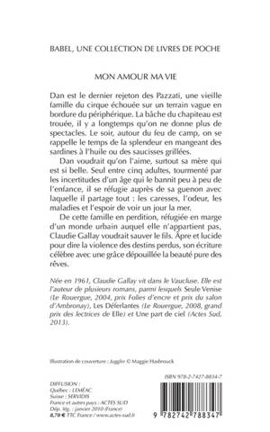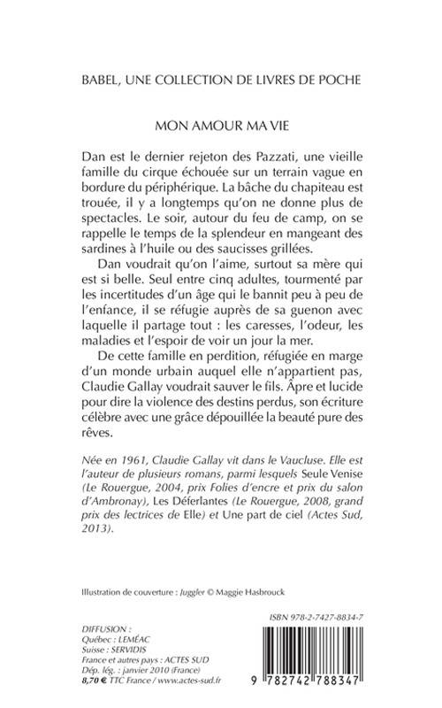 Dan est le dernier rejeton des Pazzati, une vieille famille du cirque échouée sur un terrain vague en bordure du périphérique. La bâche du chapiteau est trouée, il y a longtemps qu'on ne donne plus de spectacles. Le soir, autour du feu de camp, on se rappelle le temps de la splendeur en mangeant des sardines à l'huile ou des saucisses grillées. Dan voudrait qu'on l'aime, surtout sa mère qui est si belle. Seul entre cinq adultes, tourmenté par les incertitudes d'un âge qui le bannit peu à peu de l'enfance, il se réfugie auprès de sa guenon avec laquelle il partage tout : les caresses, l'odeur, les maladies et l'espoir de voir un jour la mer. De cette famille en perdition, réfugiée en marge d'un monde urbain auquel elle n'appartient pas, Claudie Gallay voudrait sauver le fils. Apre et lucide pour dire la violence des destins perdus, son écriture célèbre avec une grâce dépouillée la beauté pure des rêves. Née en 1961, Claudie Gallay vit dans le Vaucluse. Elle a publié aux éditions du Rouergue L'Office des vivants (2001), Mon amour ma vie (2002), Les Années cerises (2004), Seule Venise (2004, prix Folies d'encre et prix du Salon d'Ambronay), Dans l'or du temps (2006) et Les Déferlantes (2008, prix des lectrices de Elle).