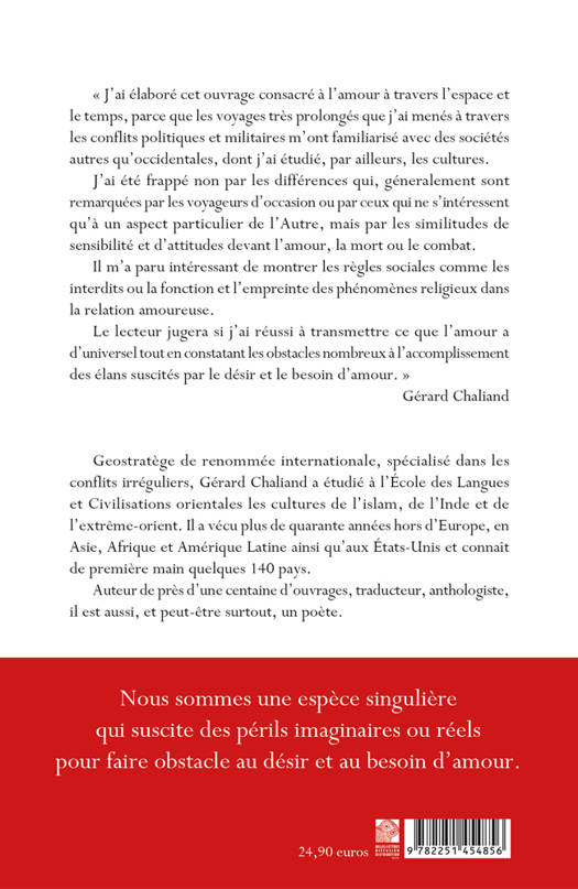"J'ai elabore cet ouvrage consacre a l'amour a travers l'espace et le temps, parce que les voyages tres prolonges que j'ai menes a travers les conflits politiques et militaires m'ont familiarise avec des societes autres qu'occidentales, dont j'ai etudie, par ailleurs, les cultures. J'ai ete frappe non par les differences qui, generalement sont remarquees par les voyageurs d'occasion ou par ceux qui ne s'interessent qu'a un aspect particulier de l'Autre, mais par les similitudes de sensibilite et d'attitudes devant l'amour, la mort ou le combat. Il m'a paru interessant de montrer les regles sociales comme les interdits ou la fonction et l'empreinte des phenomenes religieux dans la relation amoureuse. Le lecteur jugera si j'ai reussi a transmettre ce que l'amour a d'universel tout en constatant les obstacles nombreux a l'accomplissement des elans suscites par le desir et le besoin d'amour."