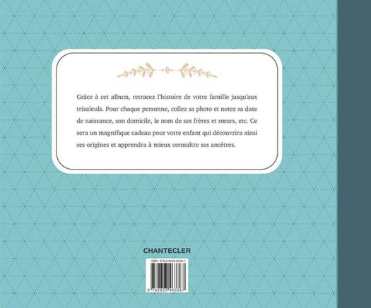 Grâce à cet album, retracez l'histoire de votre famille jusqu'aux trisaïeuls. Pour chaque personne, collez sa photo et notez sa date de naissance, son domicile, le nom de ses frères et soeurs, etc. Ce sera un magnifique cadeau pour votre enfant qui découvrira ainsi ses origines et apprendra à mieux connaître ses ancêtres. Relié avec un élastique.