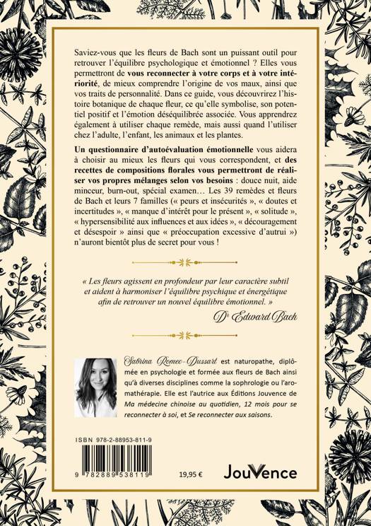 Un questionnaire d’auto-évaluation émotionnelle vous aidera à choisir au mieux les fleurs qui vous correspondent, et des recettes de compositions florales vous permettront de réaliser vos propres mélanges selon vos besoins : douce nuit, aide minceur, burn-out, spécial examen… Les 39 remèdes et fleurs de Bach et leurs 7 familles (Peurs et insécurités, Doutes et incertitudes, Manque d’intérêt pour le présent, Solitude, Hypersensibilité aux influences et aux idées, Découragement et désespoir ainsi que Préoccupation excessive d’autrui) n’auront bientôt plus de secrets pour vous !