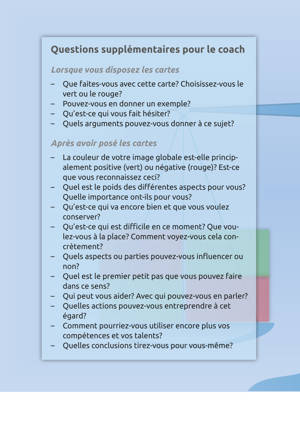 Mon bilan professionnel se compose d’un tableau de travail et de 21 cartes différentes avec des questions pour obtenir une image claire de votre situation de travail actuelle. Quels sont les éléments que vous considérez comme positifs et lesquels comme négatifs? Les cartes et les questions vous aideront à passer de la compréhension à l’action. Mon bilan professionnel vous prépare aux conversations avec votre ou vos responsables ou votre équipe. Vous pouvez le faire vous-même ou avec votre coach, votre responsable RH, votre personne de confiance, votre conseiller en prévention aspects psychosociaux, vos collègues et/ou vos supérieurs.