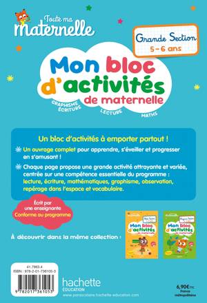 Chaque page propose une grande activité attrayante et variée, centrée sur une compétence essentielle du programme : lecture, écriture, mathématiques, graphisme, observation, repérage dans l’espace et vocabulaire.
