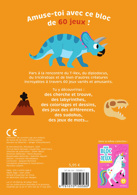 Labyrinthes, coloriages, jeux de logique, de chiffres et de lettres, codes secrets... À travers ces 60 jeux, l’enfant pourra aiguiser son sens de l’observation, sa curiosité et sa créativité tout en s’amusant grâce aux dinosaures colorés présents à chaque page !