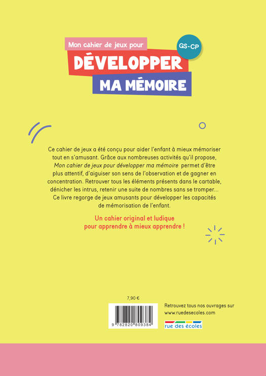 Ce cahier de jeux a été conçu pour aider l'enfant à mieux mémoriser tout en s'amusant. Grâce aux nombreuses activités qu'il propose, Mon cahier de jeux pour développer ma mémoire permet d'être plus attentif, d'aiguiser son sens de l'observation et de gagner en concentration. Retrouver tous les éléments présents dans le cartable, dénicher les intrus, retenir une suite de nombres sans se tromper...