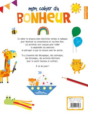 Tu y trouveras des découpages, des coloriages, des bricolages, des activités d’écriture pour te sentir heureux et confiant.