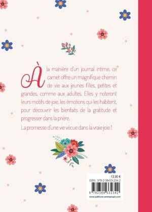 À la manière d’un journal intime, ce carnet offre un magnifique chemin de vie aux jeunes filles, petites et grandes, comme aux adultes. Elles y noteront leurs motifs de joie, les émotions qui les habitent, pour découvrir les bienfaits de la gratitude et progresser dans la prière. La promesse d’une vie vécue dans la vraie joie !
