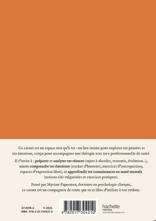 Ce carnet est un espace rien qu’à toi : un lieu intime pour explorer tes pensées et tes émotions, conçu pour accompagner une thérapie avec un·e professionnel·le de santé. Il t’invite à : préparer et analyser tes séances (sujets à aborder, ressentis, évolution…), mieux comprendre tes émotions (tracker d’humeurs, exercices d’introspection, espaces d’expression libre), et approfondir tes connaissances en santé mentale (notions clés vulgarisées et exercices pratiques). Pensé par Myriam Paperman, docteure en psychologie clinique, ce carnet est un compagnon de route que tu es libre d’utiliser à ton rythme.