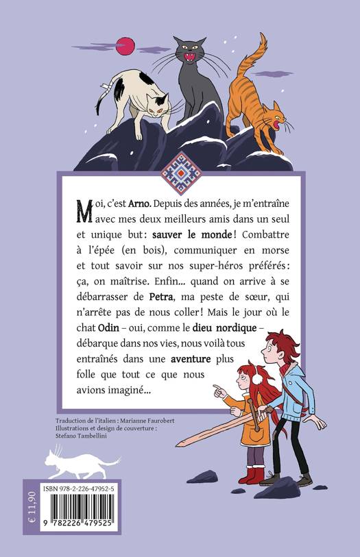Moi, c'est Arno. Depuis des années, je m'entraîne avec mes deux meilleurs amis dans un seul et unique but : sauver le monde ! Combattre à l'épée (en bois), communiquer en morse et tout savoir sur nos super-héros préférés : ça, on maîtrise. Enfin... quand on arrive à se débarasser de Petra, ma peste de soeur, qui n'arrête pas de nous coller ! Mais le jour où le chat Odin - oui, comme le dieu nordique - débarque dans nos vies, nous voilà tous entraînés dans une aventure plus folle que tout ce que nous avions imaginé...