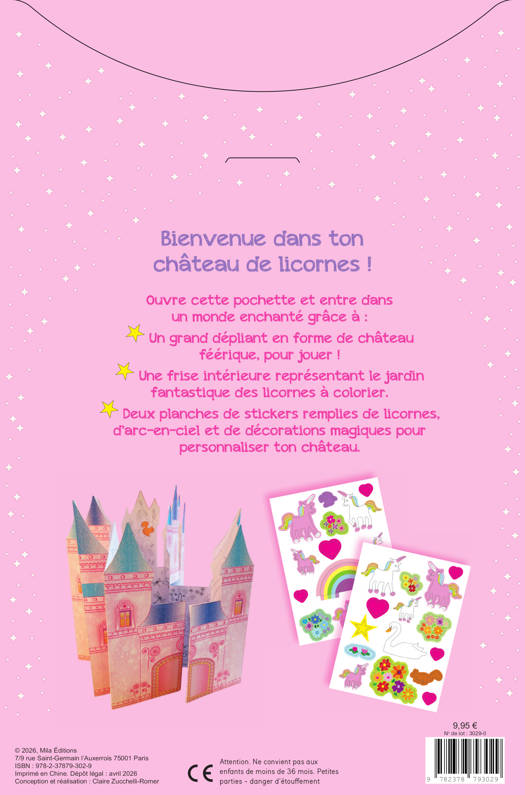 Une pochette qui renferme un grand dépliant en forme de château, à colorier, et deux planches d'autocollants remplies de licornes, d'arc-en-ciel et de décorations féériques !
