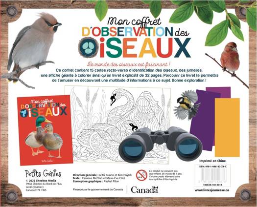 Observer les oiseaux est une activité passionnante! Ce coffret contient 15 cartes d’identification de 15 espèces différentes d’oiseaux, une paire de jumelles, une affiche géante à colorier ainsi qu’un guide pour t’initier à l’observation des oiseaux.