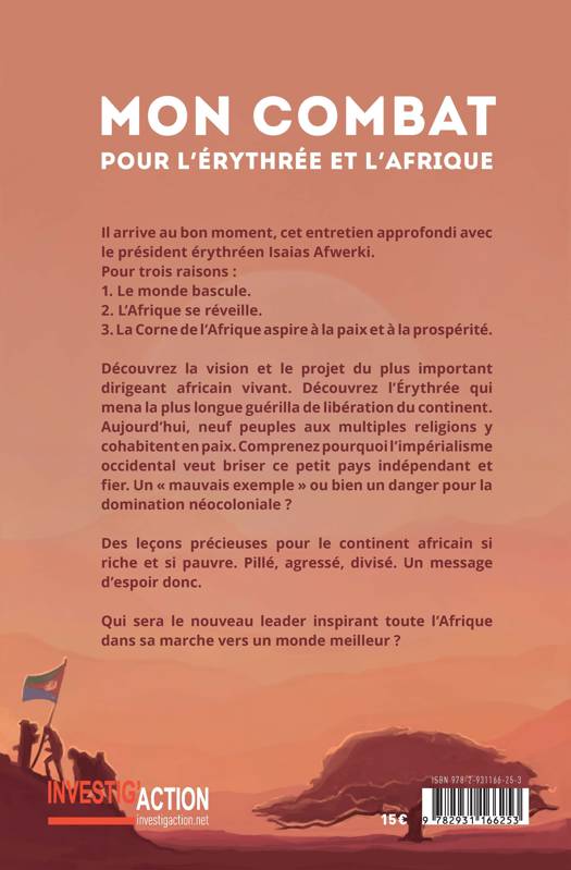Entretien avec Michel CollonPostface de Mohamed HassanIl arrive au bon moment cet entretien approfondi avec le président érythréen Isaias AfwerkiPour trois raisons 1 Le monde bascule2 L’Afrique se réveille3 La Corne de l’Afrique aspire à la paix et à la prospéritéDécouvrez la vision et le projet du plus important dirigeant africain vivant Découvrez l’Érythrée qui mena la plus longue guérilla de libération du continentAujourd’hui neuf peuples aux multiples religions y cohabitent en paix Comprenez pourquoi l’impérialisme occidental veut briser ce petit pays indépendant et fier Un mauvais exemple ou bien un danger pour la domination néocoloniale Des leçons précieuses pour le continent africain si riche et si pauvre Pillé agressé divisé Un message d’espoir doncQui sera le nouveau leader inspirant toute l’Afrique dans sa marche vers un monde meilleur