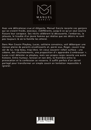 Avec une délicatesse crue et élégante, Manuel García raconte ces garçons qui se croient froids, asociaux, indifférents, jusqu'à ce qu'un seul sourire fissure leur carapace. Ses récits célèbrent la découverte, l'embarras, la jalousie, le trouble d'un jeune homme qui réalise que ses désirs ne vont pas toujours là où la famille les attend. Dans Mon Cousin Playboy, Lucas, solitaire convaincu, voit débarquer une maison pleine de parents envahissants et, parmi eux, Roger, cousin trop sûr de lui, trop beau, trop libre. Un vieux souvenir refait surface : une cabane, des chuchotements, une proposition d'« apprendre à embrasser ». Lucas croit détester ce playboy, mais son propre corps raconte une autre histoire. Entre humour, tension et non-dits, la frontière entre la provocation et la confession se resserre. Il suffit parfois d'un secret partagé pour transformer un simple cousin en tentation impossible à ignorer.