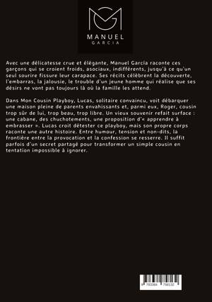 Avec une délicatesse crue et élégante, Manuel García raconte ces garçons qui se croient froids, asociaux, indifférents, jusqu'à ce qu'un seul sourire fissure leur carapace. Ses récits célèbrent la découverte, l'embarras, la jalousie, le trouble d'un jeune homme qui réalise que ses désirs ne vont pas toujours là où la famille les attend. Dans Mon Cousin Playboy, Lucas, solitaire convaincu, voit débarquer une maison pleine de parents envahissants et, parmi eux, Roger, cousin trop sûr de lui, trop beau, trop libre. Un vieux souvenir refait surface : une cabane, des chuchotements, une proposition d'« apprendre à embrasser ». Lucas croit détester ce playboy, mais son propre corps raconte une autre histoire. Entre humour, tension et non-dits, la frontière entre la provocation et la confession se resserre. Il suffit parfois d'un secret partagé pour transformer un simple cousin en tentation impossible à ignorer.
