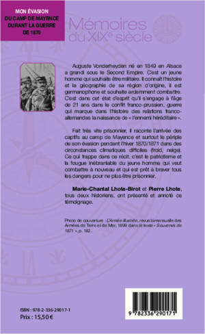 Auguste Vonderheyden, né en 1849 en Alsace, a grandi sous le Second Empire. Il s'engage à l'âge de 21 ans dans le conflit franco-prussien. Fait très vite prisonnier, il raconte l'arrivée des captifs au camp de Mayence et surtout le périple de son évasion pendant l'hiver 1870/1871 dans des circonstances climatiques difficiles. Ce qui frappe dans ce récit, c'est le patriotisme et la fougue inébranlable du jeune homme.