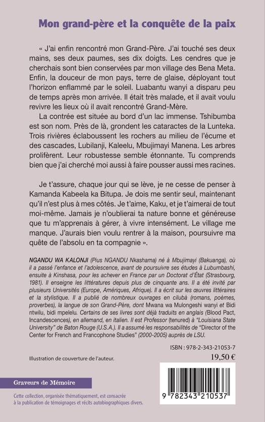« J'ai enfin rencontré mon Grand-Père. J'ai touché ses deux mains, ses deux paumes, ses dix doigts. Les cendres que je cherchais sont bien conservées par mon village des Bena Meta. Enfin, la douceur de mon pays, terre de glaise, déployant tout l'horizon en ammé par le soleil. Luabantu wanyi a disparu peu de temps après mon arrivée. Il était très malade, et il avait voulu revivre les lieux où il avait rencontré Grand-Mère. La contrée est située au bord d'un lac immense. Tshibumba est son nom. »