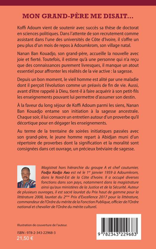 Koffi Adoum vient de soutenir avec succès sa thèse de doctorat et il s’offre un mois de repos à Adoumkrom, son village natal. Nanan Ban Kouadjo, son grand-père, accueille la nouvelle avec joie et fierté. À la faveur du long séjour de Koffi Adoum parmi les siens, Nanan Ban Kouadjo entame son initiation à la sagesse ancestrale. Chaque soir, il lui consacre un entretien autour d’un proverbe qu’il décortique pour en dégager les enseignements. Au terme de la trentaine de soirées initiatiques passées avec son grand-père, le jeune homme repart à Abidjan muni d’un répertoire de proverbes dont la signification et la moralité sont consignées dans cet ouvrage, un précieux bréviaire de sagesse.