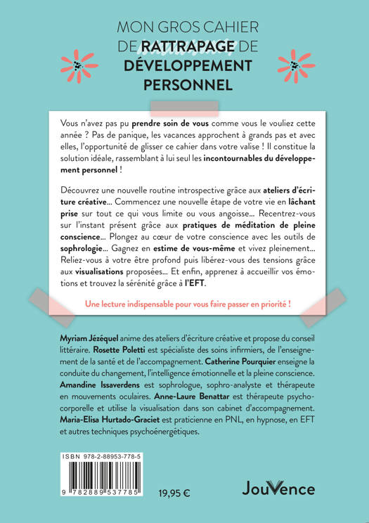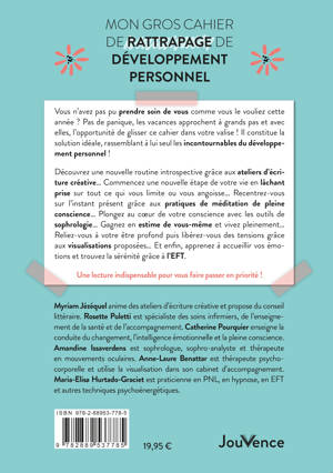 Découvrez une nouvelle routine introspective grâce aux ateliers d’écriture créative… Commencez une nouvelle étape de votre vie en lâchant prise sur tout ce qui vous limite ou vous angoisse… Recentrez-vous sur l’instant présent grâce aux pratiques de méditation de pleine conscience… Plongez au cœur de votre conscience avec les outils de sophrologie… Gagnez en estime de vous-même et vivez pleinement… Reliez-vous à votre être profond puis libérez-vous des tensions grâce aux visualisations proposées… Et enfin, apprenez à accueillir vos émotions et trouvez la sérénité grâce à l’EFT.
