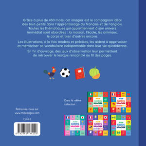 Un gros imagier de plus de 450 mots sur la vie quotidienne de l’enfant, en français et en anglais.