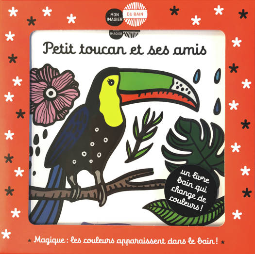 Le premier imagier du bain de bébé Petit toucan vit en compagnie de ses amis singe, grenouille, jaguar, papillon et paresseux : une première initiation aux animaux de la jungle. Un livre magique pour jouer des heures dans le bain Dès qu'on le plonge dans l'eau, les couleurs apparaissent. Dès qu'il sèche, le livre redevient noir et blanc pour jouer à l'infini. Un jeu jubilatoire pour le bain !