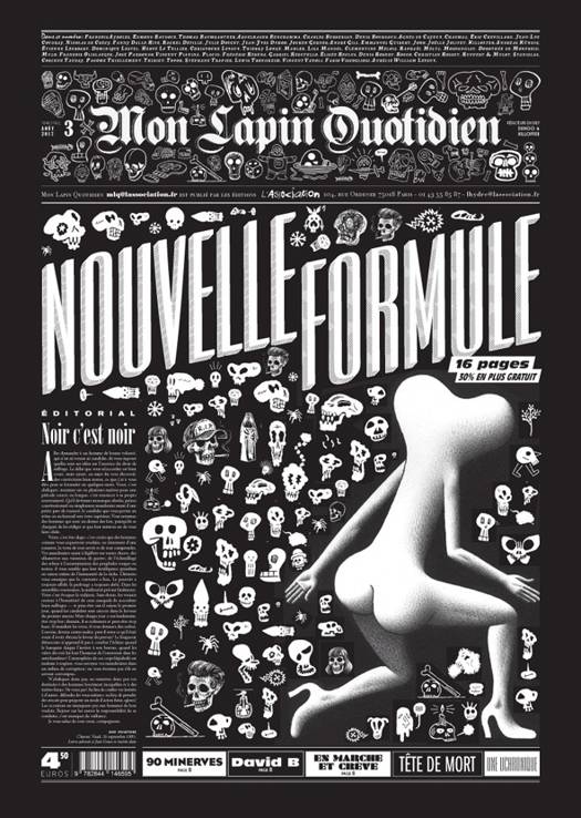 Après « NUMÉRO UN », « DERNIER NUMÉRO (EN DATE) », voici venir « NOUVELLE FORMULE », le numéro trois de Mon Lapin Quotidien. C'est logique, ça se tient (et ça vaut mieux que deux « tu l'auras »). Emballé sous une élégante une en négatif, sur le fond noir de laquelle se prélassent les blanches typos et les exquises têtes de mort exécutées par ce que la scène internationale du dessin compte de plus gratiné, les moments forts de ce numéro, en outre de nos rubriques habituelles et de nos fidèles compagnons de route (en vrac, à la louche et sans exhaustivité : « Lapinot » de Lewis Trondheim, « Vous êtes ici » de Fabio Viscogliosi, « Proposition de loi » de Jean-Yves Duhoo, « L'Autofictif » d'Éric Chevillard, « Journaux intimes d'adolescence » d'Aurélie William-Levaux et Christophe Levaux, « Belles vues » de Joko, « L'Horrorscope » de Rocco, « Lefranc Parler », par Jochen Gerner, « HP 3 » de Lisa Mandel, la rubrique « Santé » de Thomas Baumgartner, les fragments du Mexique de Raphaël Meltz, Denis Robert, etc.), seront : une pleine page apocalyptico-politico-mystico-pop de Pacôme Thiellement, illustrée avec maestria par Killoffer, deux pages et demi king size d'une bande dessinée inédite et inouïe de David B., mais aussi, accompagnés par un texte de Jean-Luc Fromental, les 90 autoportraits à la minerve de notre chère Joëlle Jolivet à qui nous souhaitons un prompt rétablissement. Des larmes, du sang et de l'os, donc. Mais aussi : de la chair, de la poilade, des nouvelles de L'Association. Encore un numéro roboratif !