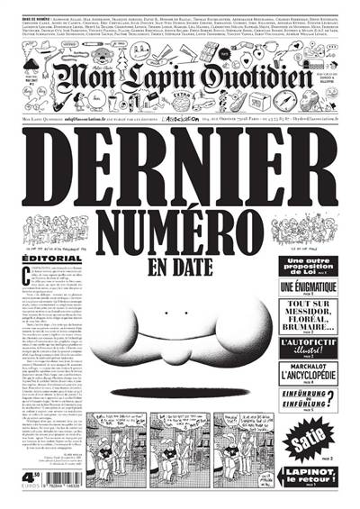 La fanfare de L’Association revient avec le n° 2 de Mon Lapin quotidien, le quotidien du trimestre. Après un n°1 remarqué, ce dernier numéro en date sera à la hauteur, ainsi qu’à la largeur du premier : MLQ fera à nouveau la part belle au dessin, avec des auteurs comme David B., José Parrondo, Killoffer, Thomas Ott, Ruppert & Mulot, Stéphane Trapier ou Fabio Viscogliosi, au texte avec des chroniques de Denis Robert, Pacôme Thiellement, Raphaël Meltz, Jean-Yves Duhoo, Aurélie William Levaux, Clémentine Mélois, Thomas Baumgartner, Christian Rosset ou Éric Chevillard, à la bande dessinée avec Lewis Trondheim, Berberian, Emmanuel Guibert, Dorothée de Monfreid, Vanoli, Lisa Mandel, Placid, Jochen Gerner, Julie Doucet, Nicolas Malher ou Étienne Lécroart, entre autres et non des moindres… MON LAPIN QUOTIDIEN, le journal impossible à plier mais possible à publier, vous informera à nouveau sur tout un tas de sujets dont vous pensiez vous foutre éperdument jusqu’à présent, sans savoir qu’il vous passionnent quand c’est Mon Lapin quotidien qui vous en parle, à sa façon inimitable, toujours dans un élégant noir et blanc mariant texte, image et typographie moderne.