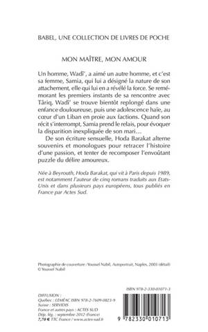 Comment Wadî', après avoir vécu au Liban dans l'intimité de trafiquants d'armes et de drogue, se retrouve à Chypre dans un état second, et comment il s'éprend de l'homme qu'il appellera "mon maître, mon amour"... L'écriture dense et précise alterne souvenirs et monologues intérieurs pour évoquer la passion comme un puzzle inachevé.